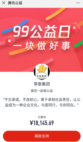 9月5日至15日,為加強企業(yè)文化建設,奉獻榮泰人的愛心,建設“仁者愛人、與人為善”的富有人文關懷的慈善愛心企業(yè),激勵榮泰人以慈善為本,以榮泰人為榮,實現(xiàn)企業(yè)同發(fā)展、共雙贏的情懷,集團積極參與“騰訊公益慈善基金會”聯(lián)合舉辦的“99公益日一塊做好事,榮泰集團慈善一起捐”活動。