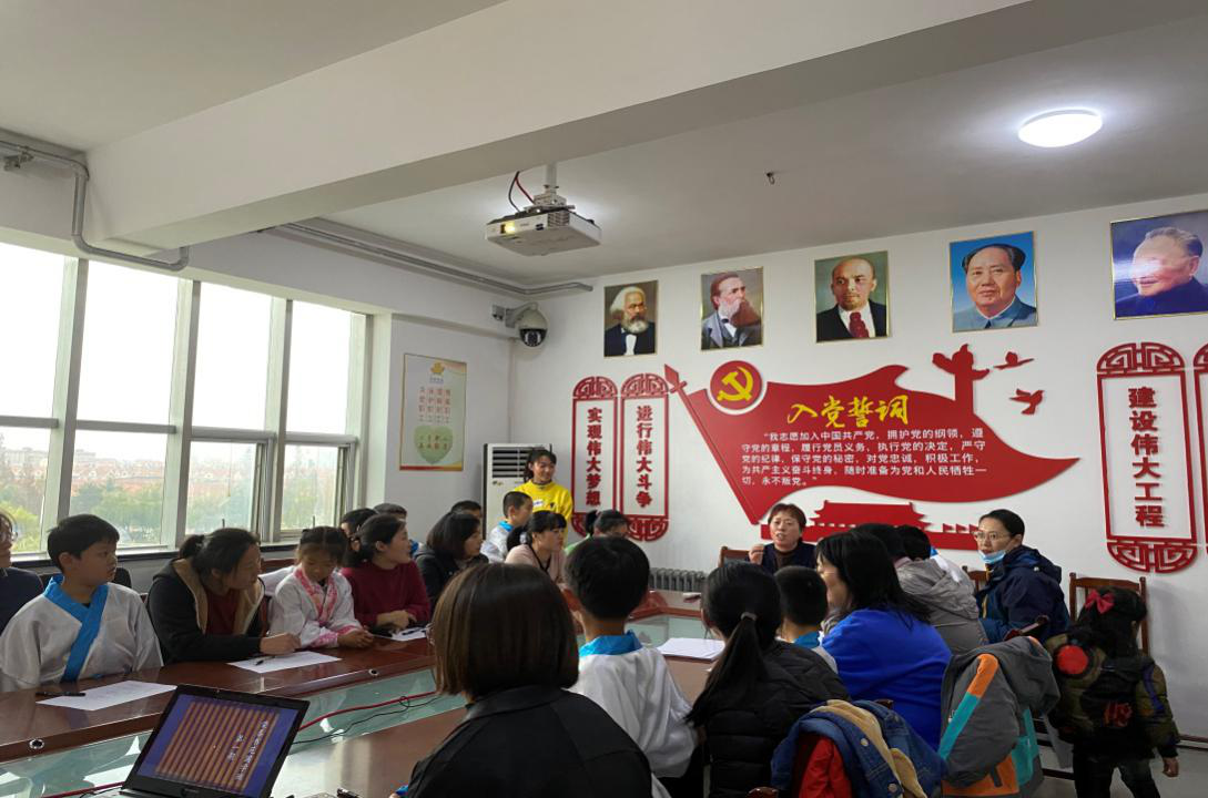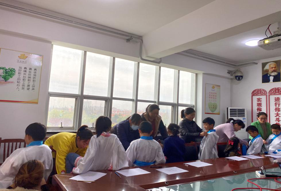 職工及家屬帶著孩子們來到會議室,孩子們一個個熱情高漲,臉上洋溢著燦爛的笑容,職工及家屬們也都面露喜色,期待著這次別開生面的開營典禮。為營造國學課的良好氛圍,典禮開始之前,吳主席組織家長給孩子們換上漢服,孩子們穿上漢服,開心地站在父母身側。