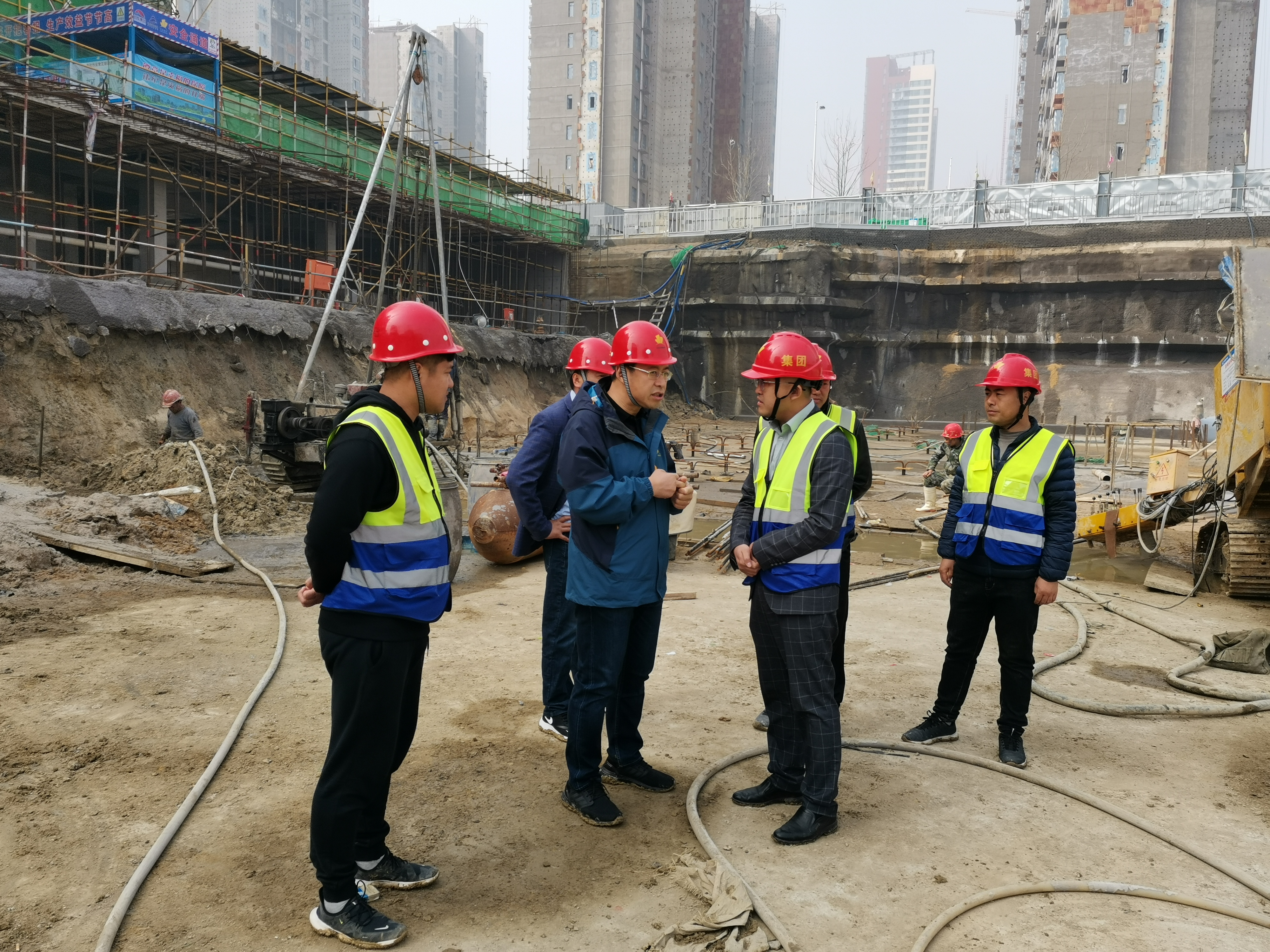 由集團(tuán)承建的大荒莊村莊改造項(xiàng)目,屬隱珠街道辦事處2021年重點(diǎn)建設(shè)民生項(xiàng)目,總占地約6.29萬平方米,總建筑面積約23.05萬平方米,共包含13個(gè)單體工程,其中17層住宅6棟、18層住宅6棟、社區(qū)公共用房1棟4層,總建設(shè)規(guī)模約22萬平方米,安置居民582戶。目前,該項(xiàng)目進(jìn)入關(guān)鍵施工階段,項(xiàng)目部上人員、上機(jī)械、保材料、保安全,全力以赴推進(jìn)工期。在項(xiàng)目工地,薛鵬董事長下到工地現(xiàn)場(chǎng),與項(xiàng)目負(fù)責(zé)人深入交流、了解項(xiàng)目進(jìn)度、質(zhì)量、安全、物資供應(yīng)、勞務(wù)人員上崗等各項(xiàng)工作情況,對(duì)分部分項(xiàng)關(guān)鍵施工工序進(jìn)行了檢查指導(dǎo),對(duì)應(yīng)注意的細(xì)部處理部位進(jìn)行了周密部署,對(duì)現(xiàn)場(chǎng)管理方面存在的問題進(jìn)行嚴(yán)格要求。要求項(xiàng)目部成員必須高度重視項(xiàng)目質(zhì)量和安全文明施工等各項(xiàng)工作,要周密部署,細(xì)致做好人員和物資保障,項(xiàng)目嚴(yán)格按照施工規(guī)范和主管部門要求進(jìn)行精細(xì)化施工,全力以赴按進(jìn)度計(jì)劃推進(jìn)項(xiàng)目工期,為保障大荒莊居民順利回遷打下良好的基礎(chǔ)。