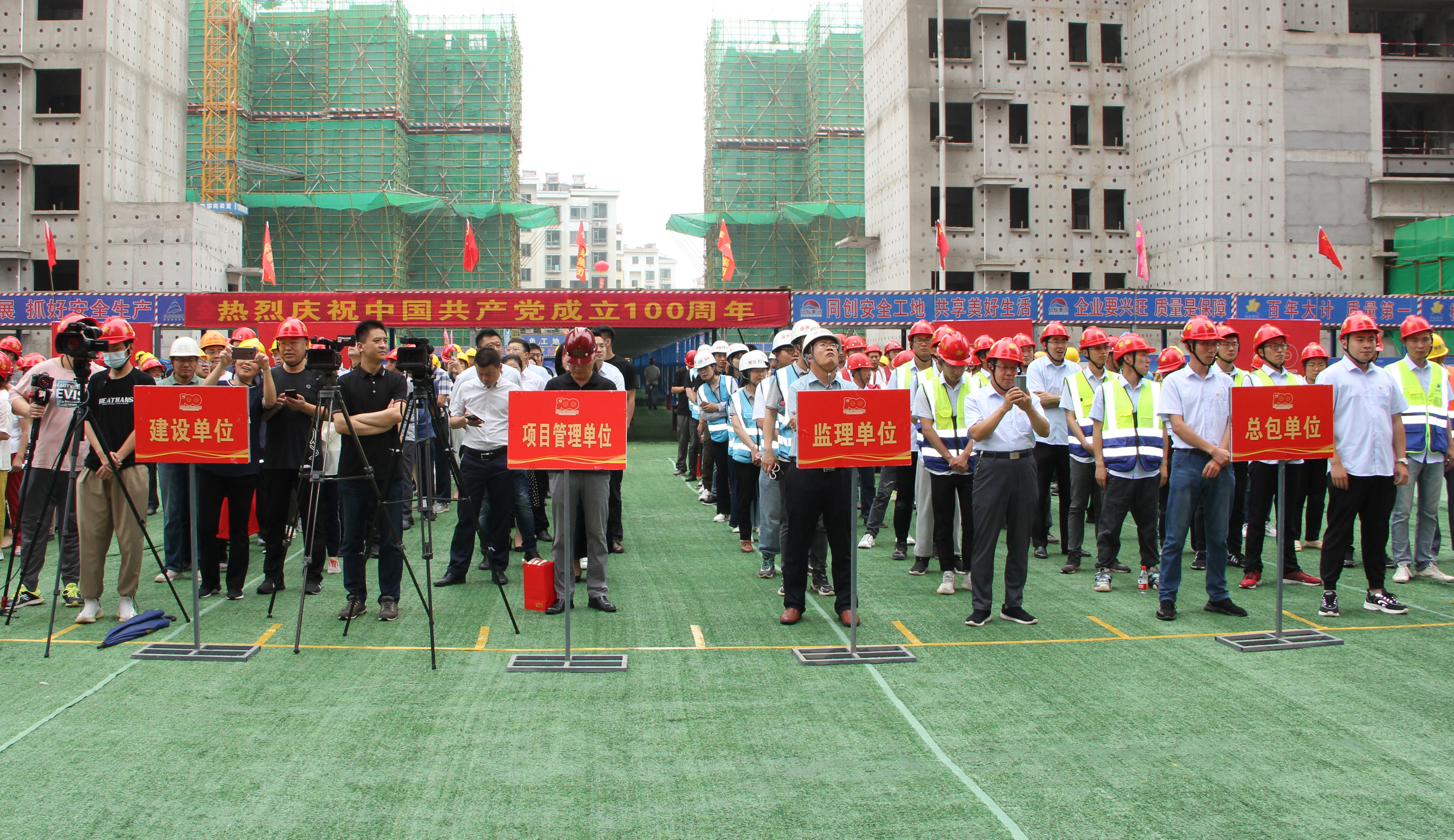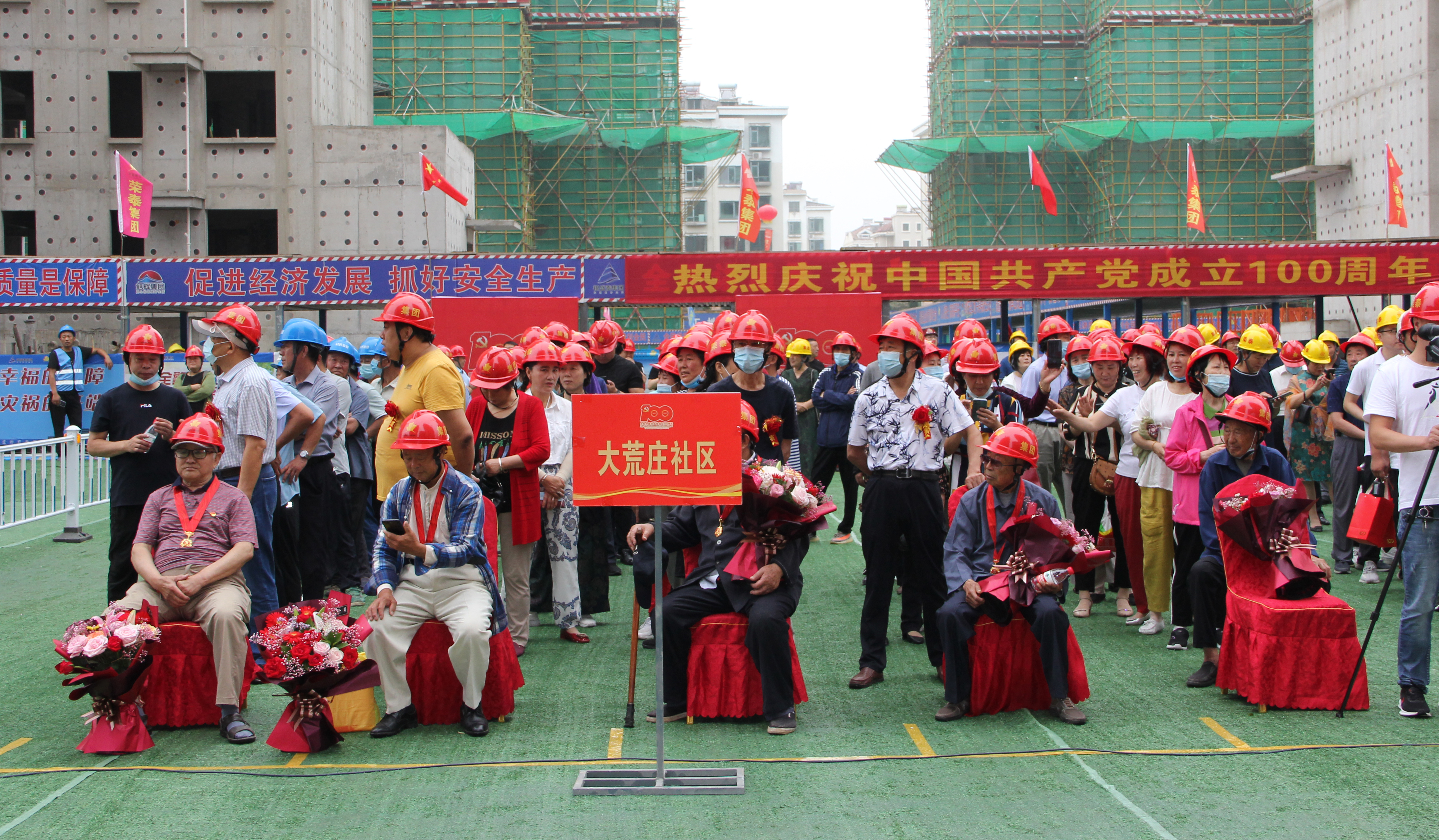 2021年6月28日上午,在喜迎中國共產(chǎn)黨成立100周年之際,大荒莊社區(qū)建設(shè)現(xiàn)場人頭攢動,由榮泰建設(shè)集團承建的大荒莊社區(qū)項目主體封頂儀式隆重舉行。