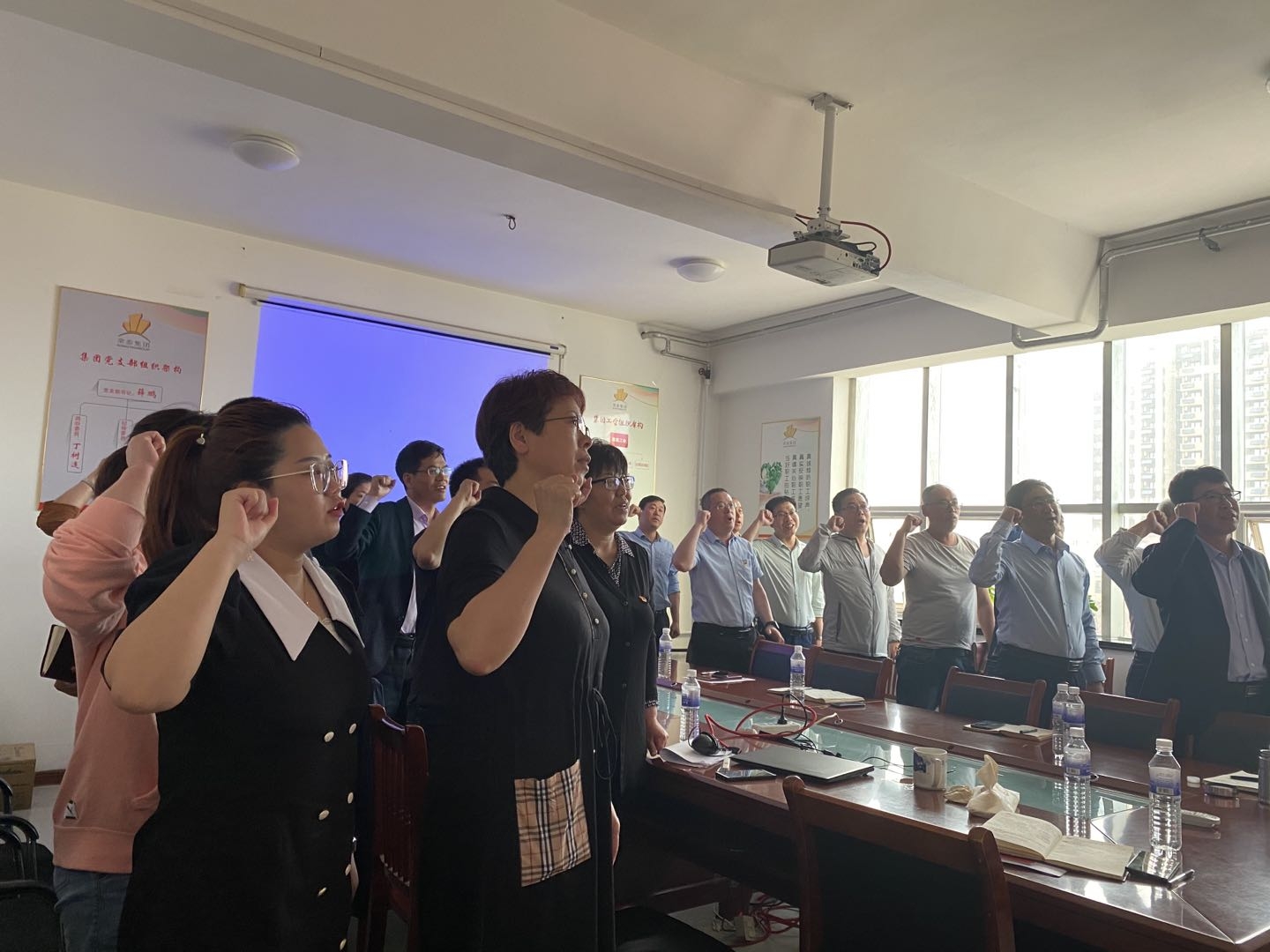 慶祝建黨100周年,5月22日由組織委員丁樹連帶領全體黨員一起重溫入黨誓詞。面對黨旗,大家舉起右手,鏗鏘有力的宣誓聲讓現(xiàn)場所有人都深受感染,大家紛紛表示,要不忘教育初心,牢記立德樹人使命,立足崗位實際,砥礪前行,發(fā)揮黨員模范帶頭作用。