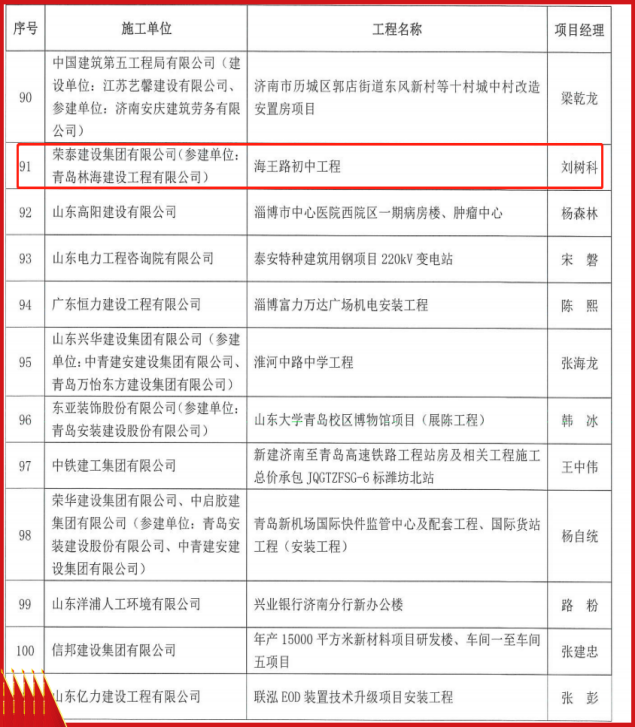 青島市級獎項(xiàng):青島市民營企業(yè)100強(qiáng)稱號;青島市工程研究中心通過;青島市總部企業(yè)認(rèn)定;青島市拆除項(xiàng)目觀摩工地;BIM創(chuàng)新優(yōu)智杯6項(xiàng);青島市安全文明標(biāo)準(zhǔn)化示范工地等多個獎項(xiàng)。