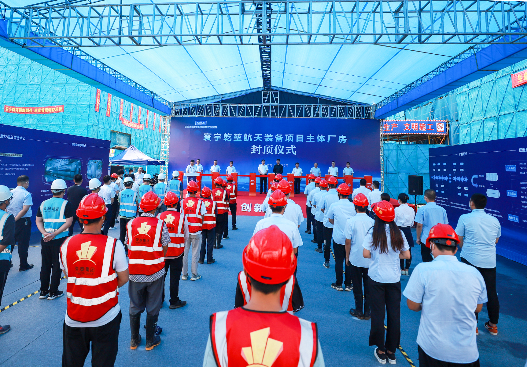 青島海洋高新區(qū)工委管委、膠南街道辦事處、黃島區(qū)國內(nèi)招商促進(jìn)中心、海高集團(tuán)、融發(fā)集團(tuán)、上海寰宇乾堃航天科技有限公司、青島寰宇乾堃航天設(shè)備有限公司、建通浩源集團(tuán)有限公司、榮泰建設(shè)集團(tuán)有限公司等相關(guān)部門和企業(yè)領(lǐng)導(dǎo)出席了封頂儀式。