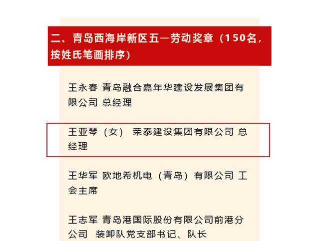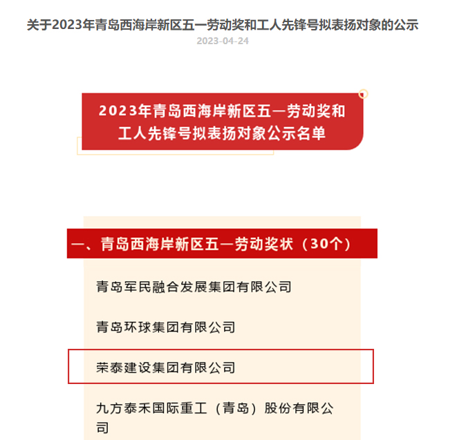 近日,榮泰集團榮獲西海岸新區(qū)五一勞動獎狀。
