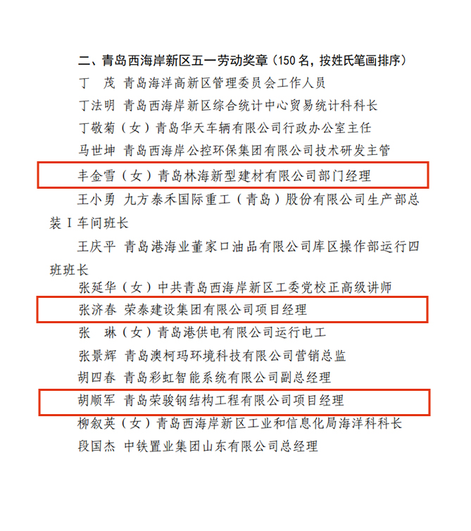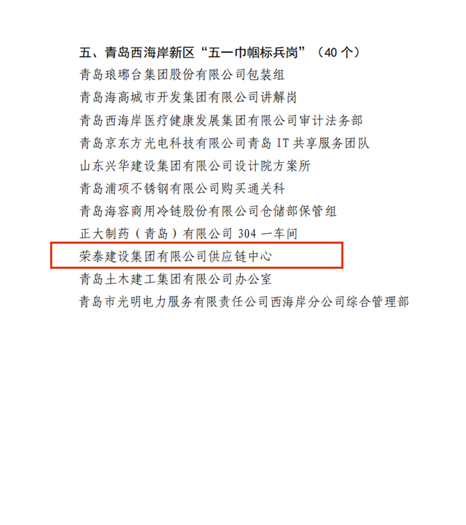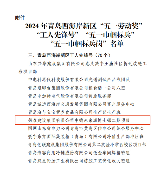 近日,西海岸新區(qū)總工會印發(fā)《關于公布 2024 年青島西海岸新區(qū)“五一勞動獎”“工人先鋒號”“五一巾幗標兵”“五一巾幗標兵崗”的通知》,隆重表彰了西海岸新區(qū)各行各業(yè)的先進集體和先進個人。榮泰建設集團2個集體、3名個人光榮上榜。
